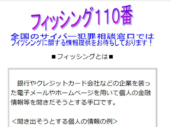 フィッシング110番のWEBデザインてどーよ? 日記 2019.11.07 フィッシング110番という、フィッシング対策のサイト自体が怪しくて不安になる・・・ バナーというかトップのロゴ、ウェブアートデザイナーですよね? ホームページビルダーについてる。 作った覚えありますもん。15年くらい前に。 クリックすると、さらに不安が倍増。 私もtableタグでレイアウトしてたわ。10年くらい前まで。 てか、本当にIT系の人材がいないということがよくわかる。 現場のおまわりさんのためにも、かけるコストはかけたほうがいいと思う。