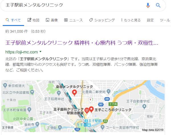 ここはHPは一応あるんです。 ですが、マップには未登録。 そのためマップでは、自分の病院名で検索してもでてきません。   近くのほかの心療内科が紹介されてしまうんですね。 王子駅前メンタルクリニック   普通に検索しても検索結果にマップが表示され、そこには存在しません。 王子駅前メンタルクリニック   ちなみにウチにはポスティングのチラシが入っていました。 近隣の見込み客に対する方法としては定番ですよね。 でもその見込み客が興味をもって検索したら、Googleにはでてこない。 それよりくわしく、ほかの心療内科が紹介されるわけです。 こわっ!   逆に考えると登録をしてあれば、集客のきっかけになりますよね。 ほかの病院が同じこと(マップ登録をせずにチラシなどを頑張った場合)をやったときに、近くの自院をPRしてくれるわけです。 意味わかりますよね?     今までは「ネットはよくわからない」でも、あまり悪影響はありませんでした。 でもこれだけスマホが日常の必需品になると、話が違ってきます。 やらなければ、やってる人との差が大きく開いてしまうということですね。   あ、【アップルマップ】 もついでに登録しておきましょう♪     関連記事:【店舗はGoogleマイビジネスの登録は必須】