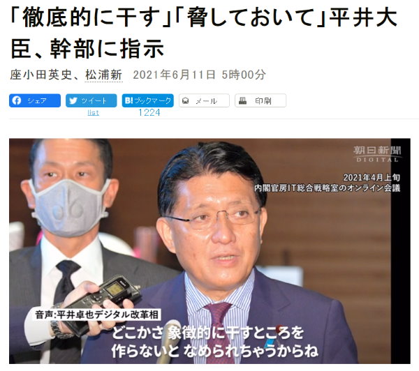 「徹底的に干す」「脅しておいて」平井大臣、幹部に指示:朝日新聞