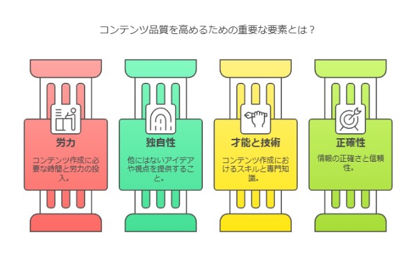 語り手: そうなんです。 「労力」「独自性」「才能や技術」「正確性」この4つが重要なんです。 例えば、適当な記事より手間をかけた独自のコンテンツが評価されるんですよ。