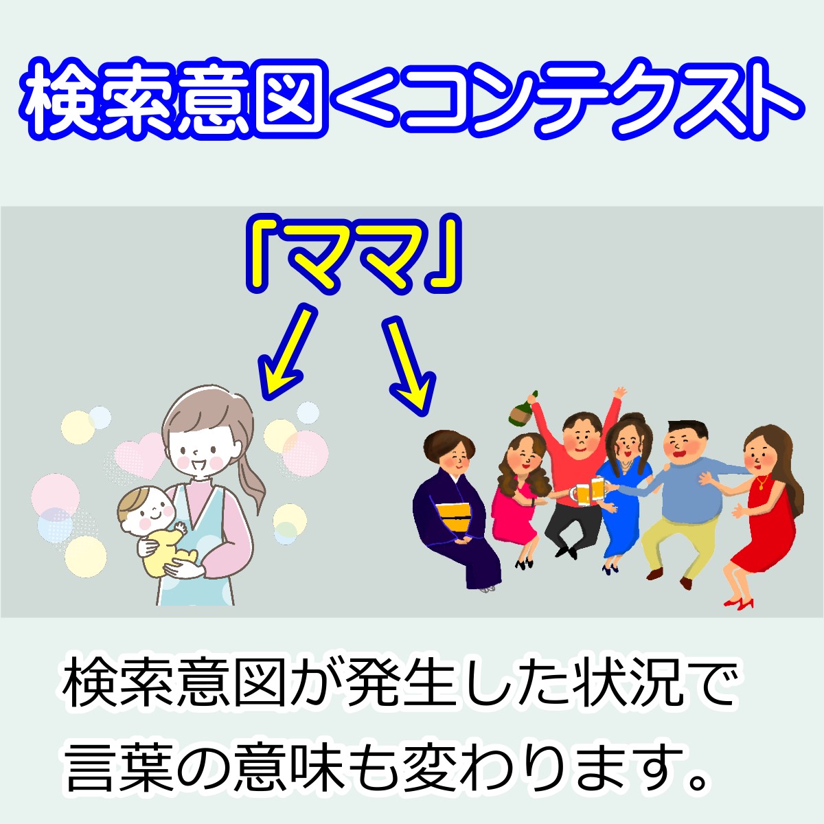 SEOでも広告でも、検索されるのはキーワード。 そしてそのキーワードの検索意図が大切です。 そしてもう1歩踏み込みたいのが、検索意図のコンテクスト(背景)です。 検索するにいたった理由です。 コンテクストはほかにも「状況」「前後関係」、「文脈」などと訳されます。   「ママ」というキーワードでも、子どもがお母さんに対して言うのと、銀座のクラブホステスがいうのは意味が違いますよね。 つまりキーワードが同じでも、意味が違うわけです。   同じように「パパ」でも、娘がお父さんに言う場合と、、、 やめときますw   このようにキーワードはコンテクストによって意味が変わるのです。 なのでどういう状況だから検索したのか? というコンテクストまで意識するとターゲットは明確になり、コンテンツの質も自然と上がります。