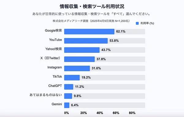 検索エンジンの「一強時代」に変化の兆し──生成AI・SNS・動画との使い分けが拡大【全国1,200名対象・デジタル検索行動調査 – 株式会社メディアリーチ調査】