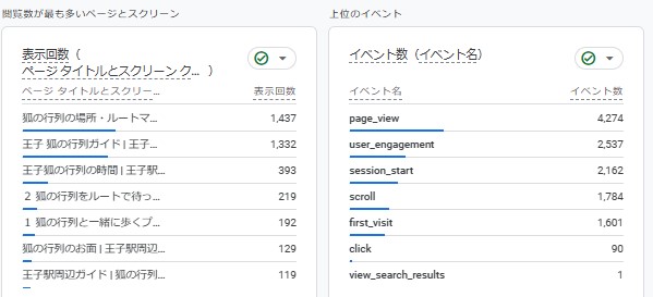 今回の例だと年末のイベントで、キーイベント(コンバージョン)もなし。1つ案内板にQRコードから「ガイドトップ」への誘導で、次に見られているのは「時間」でその次が「ルート」です。なので次回は時間やルートを案内板に足そうかな?と考えたりします。