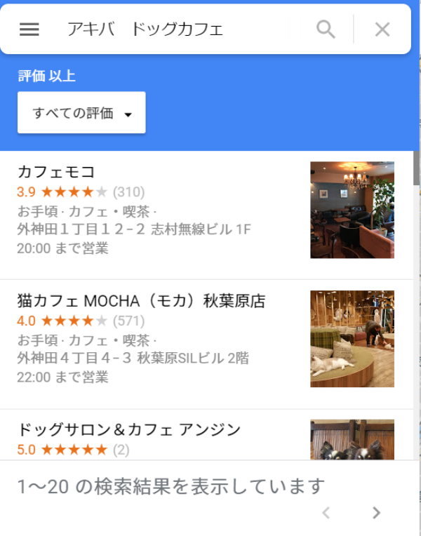 わんちゃんが好きなので、「アキバ ドッグカフェ」と検索したとします>