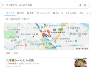 ※検索結果は他の要因でかわるけど、ラーメン店が出ます。
