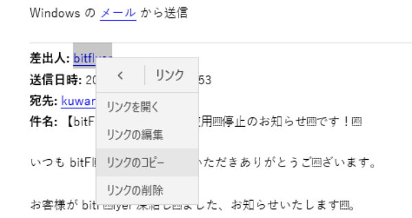 この場合「bitflyer」と表示されていましたが、コピペでチェックすると「mailto:office@myyls*p.com」というドメインでした。この時点でかなり怪しいですよね。※正式なドメインは「*」で伏せます。