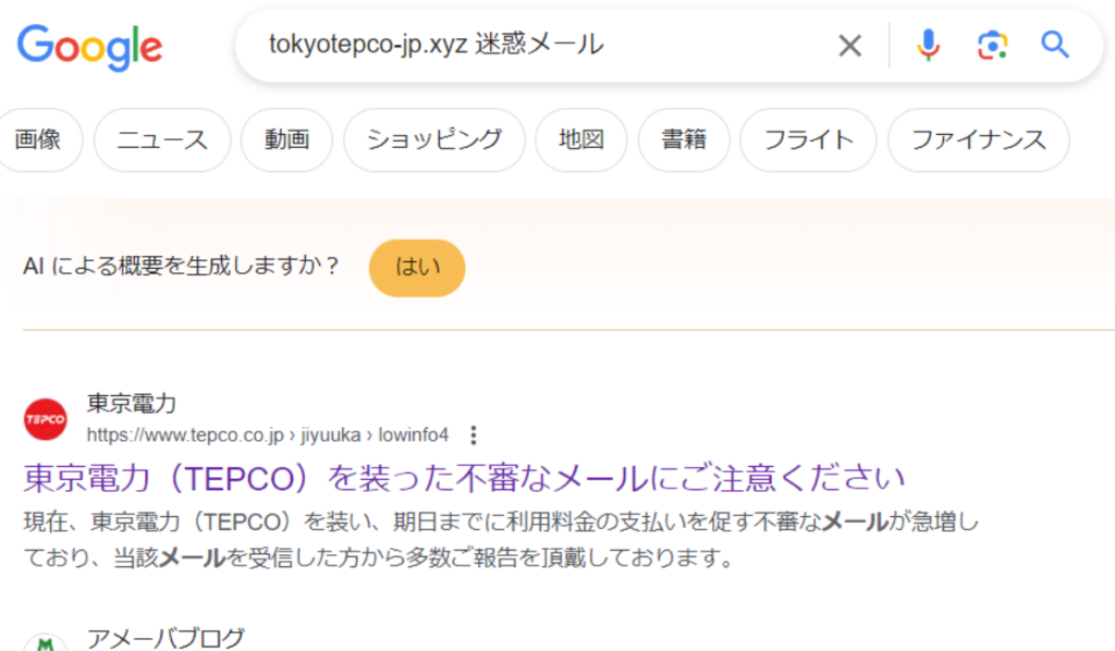 するとありました。「tokyotepco-jp.xyz 迷惑メール」などで検索ですね。