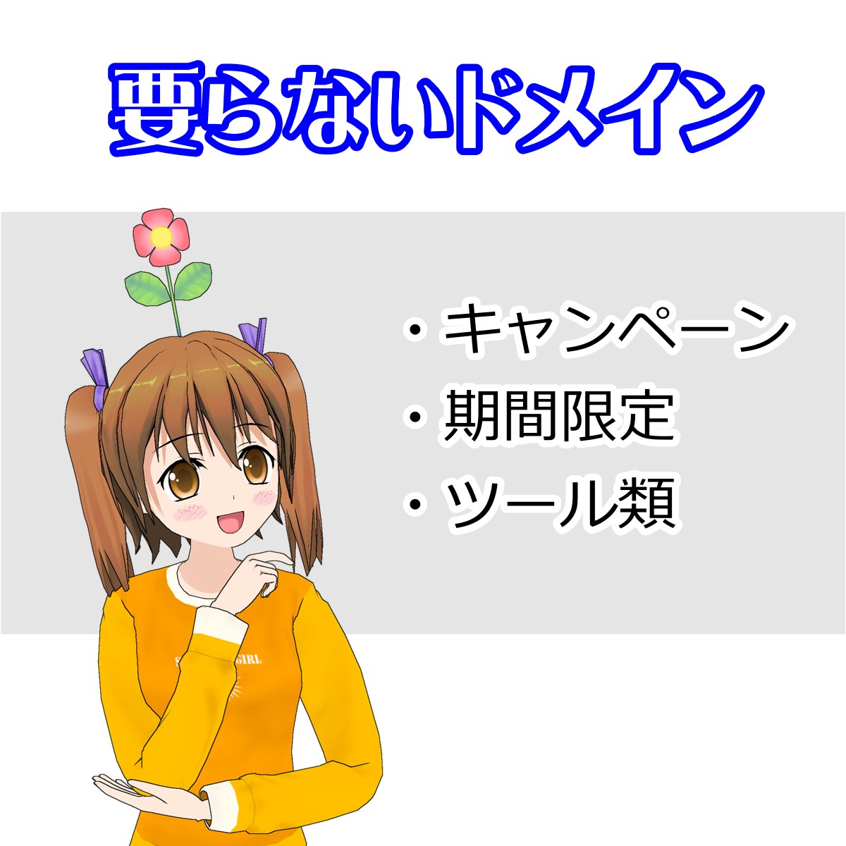 このように手放す予定があったり、期間限定で終了してしまうもの。 またはツール類でドメインを維持してもあまり意味がない場合は、独自ドメインは不要でしょう。   理由は、使わなく成ったドメインを手放すと、中古ドメインとして他人に使われてしまうからです。 いや別に終わったのなら、他人に使われてもかわないんだけど。 なんて思うでしょうか。私は思いません。