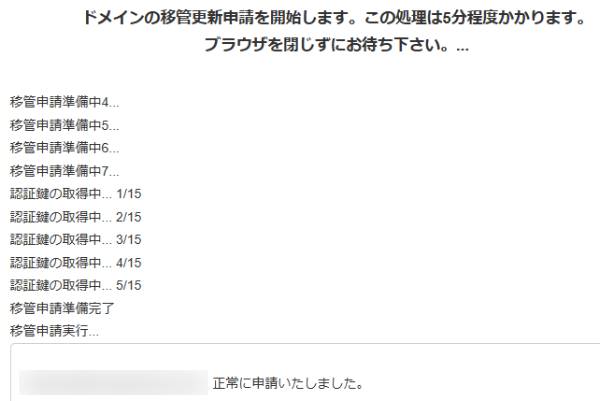 結果として、なんのトラブルもなくドメインの移管までが1クリックで進行中。