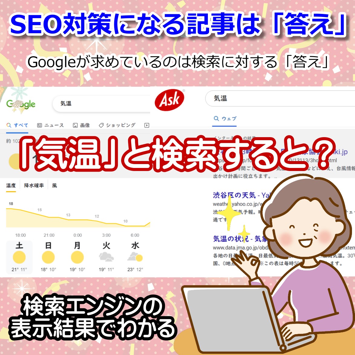 この「気温」からわかることは、検索キーワードから意図を判断している。 「解答」がある場合は、検索結果に「答え」そのものを表示する。 しかしGoogleは「答え」をもっていない。 つまり、Googleが欲しいのは「答え」というコンテンツ。 優良なコンテンツ、役に立つコンテンツ。 曖昧な表現ですが、明確なのは「答え」ということですね。 暇つぶしやコミュニケーションはSNSやゲームへ。 だからこそビジネスではしっかりと、検索者を見込み客にできるようにしましょう。   日記なんて書いてる場合ではないですぞ。
