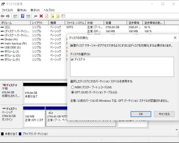 • ディスクを右クリック → 「ディスクの初期化」(GPTを選択)