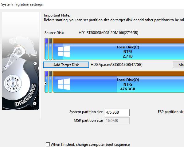 ソースを現在のHDD(Disk 1)、ターゲットを新しく接続したApacer SSD(Disk 0)に指定して実行したところ……