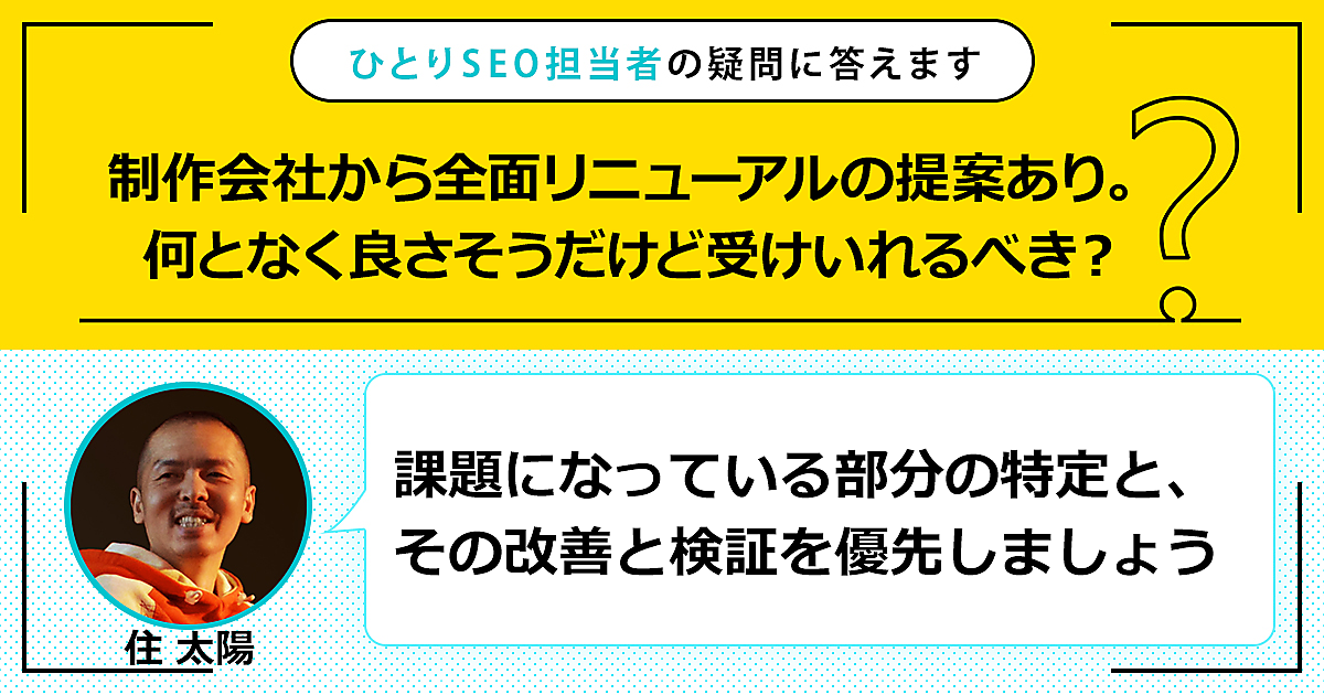 今回の質問は「制作会社から全面リニューアルの提案あり。何となく良さそうだけど受けいれるべき?」です。この回答は「課題になっている部分の特定と、その改善と検証を優先しましょう」です。