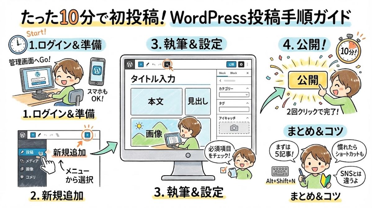 初心者でも管理画面にログインしてから公開まで約10分で完了できます。タイトル入力、本文作成、カテゴリー設定、アイキャッチ画像の登録、スラッグ編集などを行い、最後に「公開」ボタンを2回押すだけです。慣れると5分以内で投稿できる場合もあります。
