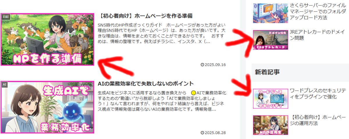 当サイトの場合、記事の上に大きく表示されたり、一覧では小さく表示される画像です。