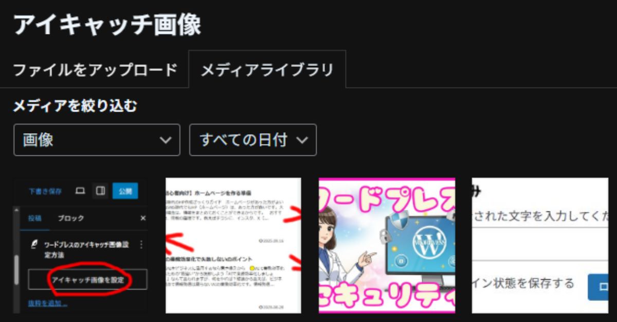 - 右下の「アイキャッチ画像として設定」を忘れずにクリック!
