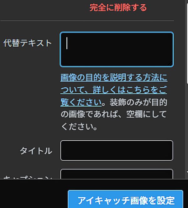 5. 「代替テキスト」と「タイトル」を入力し、「アイキャッチ画像を設定」をクリック。