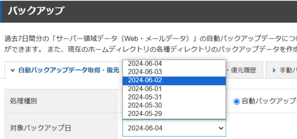 と考えたら、たしかエックスサーバーは自動バックアップがあったはず。